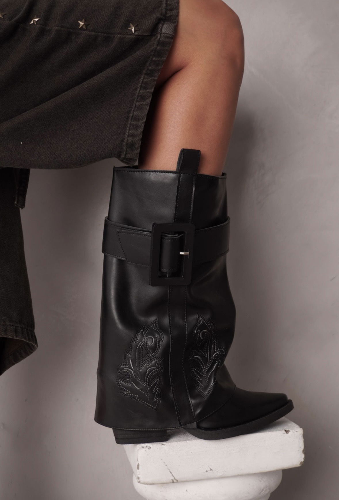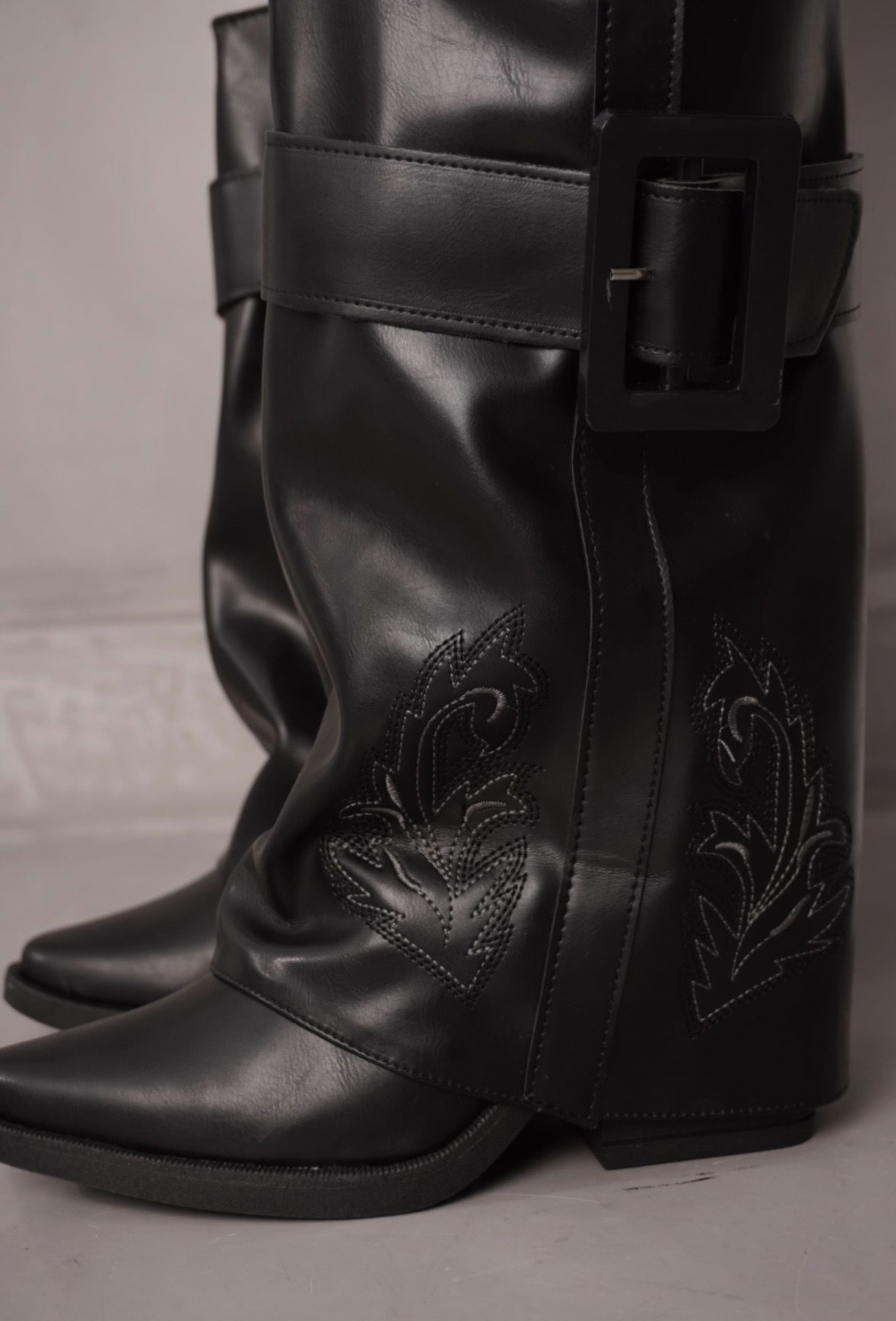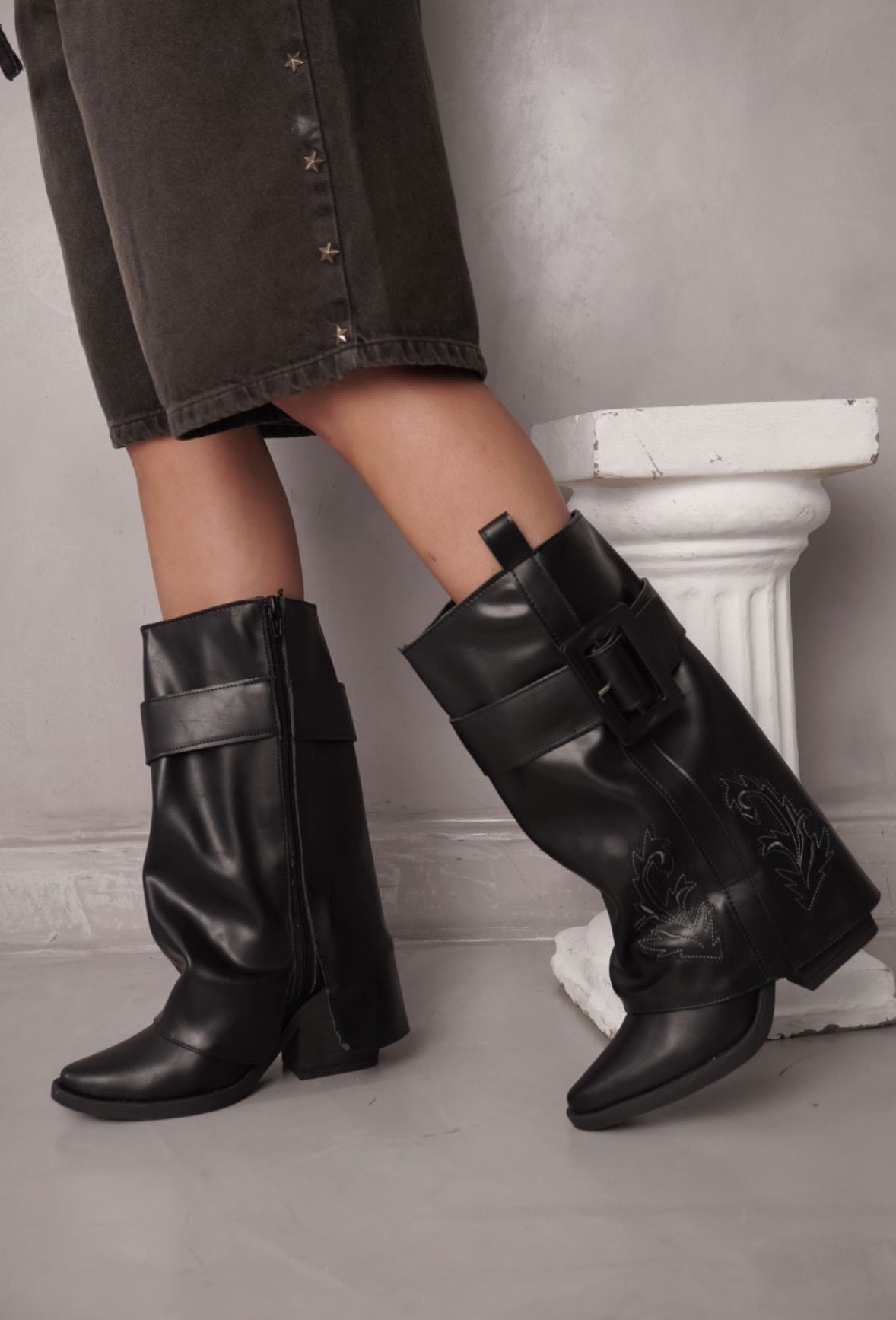 Texanas de eco cuero (bordadas) base de goma inyectada con taco de 9 cm, alto de caña de 30 cm