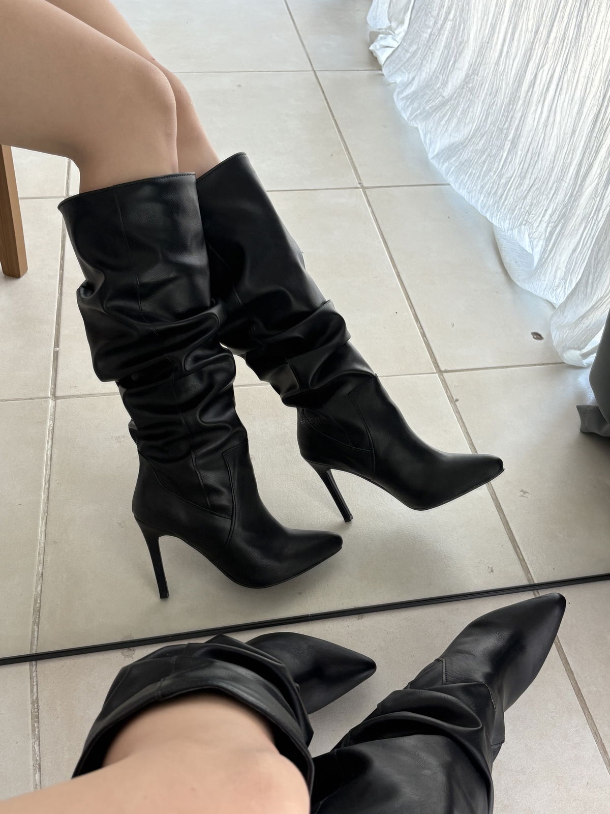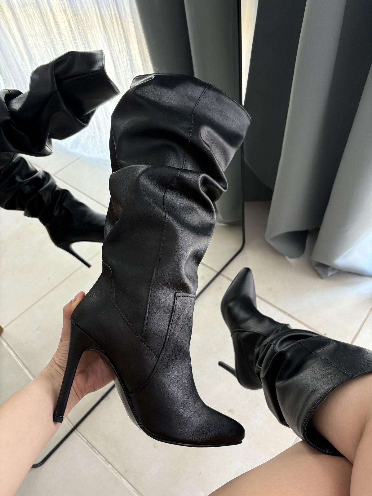 Eco cuero, taco aguja de 8 cm aprox, caña de 40 cm y circunferencia en pantorrilla de 40 cm 💗